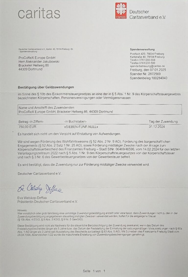 ProCoReX Europe GmbH engagiert sich aktiv durch regelmäßige Spenden an soziale Projekte und Organisationen wie die Caritas. Mit diesem Engagement unterstützt das Unternehmen gezielt Menschen in Not und trägt zur Verbesserung ihrer Lebenssituation bei. So verbindet ProCoReX professionelle IT-Entsorgung mit gelebter sozialer Verantwortung und nachhaltiger Hilfe.